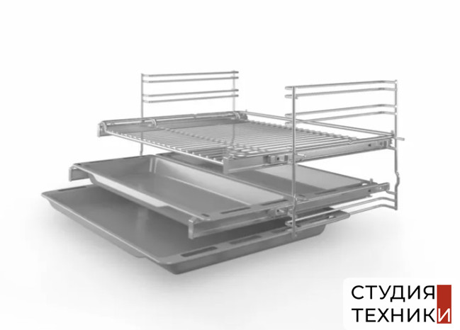 Принадлежности:- 2 узких противня- 1 универсальный противень- 1 решетка- Телескопические направляющие на 2-х уровнях