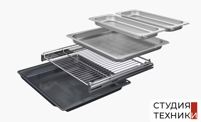 Принадлежности:- Контейнер для пара перфорированный размера M- Контейнер для пара перфорированный размера XL- Контейнер для пара неперфорированный размера M- Сетка- Губка- Универсальный противень- Телескопические направляющие