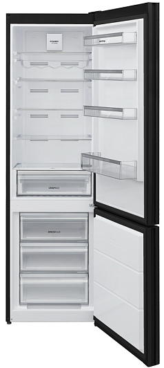 Общие характеристики:- Тип: отдельностоящий- Вид: холодильник с морозильной камерой- Количество камер: 2- Количество компрессоров: 1 - Разморозка холодильной камеры: No Frost- Разморозка морозильной камеры: No Frost- Общий объем холодильника: 360 л- Полезный объем холодильной камеры: 266 л- Полезный объем морозильной камеры: 94 л- Цвет: черный- Уровень шума: 42 дБ- Класс энергетической эффективности: A+- Годовое потребление энергии: 325 кВтч/год- Размеры (ВхШхГ): 201х59.5х65 см