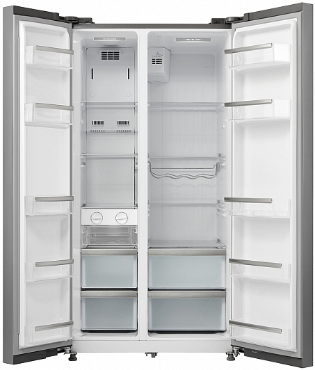Общие характеристики:- Тип: отдельностоящий- Вид: Side by Side- Количество камер: 2- Количество компрессоров: 1 - Разморозка холодильной камеры: No Frost- Разморозка морозильной камеры: No Frost- Общий объем холодильника: 510 л- Полезный объем холодильной камеры: 335 л- Полезный объем морозильной камеры: 175 л- Цвет: нержавеющая сталь- Уровень шума: 43 дБ- Класс энергетической эффективности: A+- Годовое потребление энергии: 424 кВтч/год- Размеры (ВхШхГ): 178.8х89.5х69 см