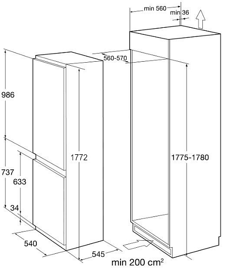 Общие характеристики:- Тип: встраиваемый- Вид: холодильник с морозильной камерой- Количество камер: 2- Количество компрессоров: 1 - Разморозка холодильной камеры: No Frost- Разморозка морозильной камеры: No Frost- Общий объем холодильника: 248 л- Полезный объем холодильной камеры: 180 л- Полезный объем морозильной камеры: 68 л- Цвет: белый - Уровень шума: 39 дБ- Класс энергетической эффективности: A+- Годовое потребление энергии: 293 кВтч/год- Размеры (ВхШхГ): 177.2х54х54.5 см- Размеры ниши для встраивания: 177.5-178х56-57х56 см