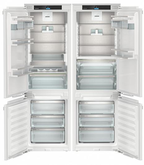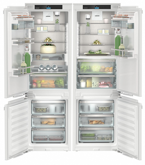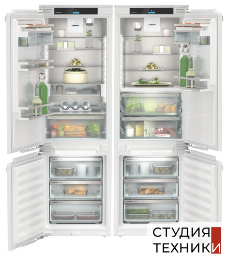 Общие характеристики:- Тип: встраиваемый- Вид: Side by Side (SICNd 5153 / ICBNd 5153)- Количество камер: 4- Количество компрессоров: 2- Разморозка холодильной камеры: автоматическая- Разморозка морозильной камеры: No Frost- Общий объем холодильной камеры: 484 л- Полезный объем холодильной камеры: 364 л- Полезный объем морозильной камеры: 120 л- Полезный объём зоны свежести: 69 л- Уровень шума: 36 дБ- Цвет: белый- Класс энергетической эффективности: А++- Размеры (ВхШхГ): 177х55.9х54.6 см- Размеры ниши для встраивания (ВхШхГ): 177.2-178.8х56-57х55 см Управление, функции:- Элементы управления: сенсорные- Дисплей Touch&Swipe display- Индикация температуры холодильной камеры- SmartDevice беспроводное устройство для управления со смартфона- SmartDeviceBox (возможность дооснащения)- NightMode: ночной режим настраивается через приложение- SabbathMode: выключено всё освещение холодильника, а также все звуковые сигналы, шумы и экран. Режим SabbathMode отключается через 80 часов- Режим «Отпуск»- CleaningMode: при чистке холодильника охлаждение выключается, а освещение остаётся включённым- PartyMode - активируются функция SuperCool для максимального производства льда- Система SuperCool, быстрое охлаждение (настраивается через приложение)- Быстрая заморозка SuperFrost (настраивается через приложение)- IceCubeTimer (настраивается через приложение)- Циркуляционное охлаждение- Регулируемый диапазон температур холодильного отделения от +2 С до +9 С