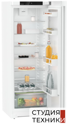 Холодильник Liebherr Rf 5000Общие характеристики:- Тип: отдельностоящий- Вид: холодильник без морозильника- Количество камер: 1- Количество компрессоров: 1- Разморозка холодильной камеры: автоматическая- Полезный объем холодильной камеры: 347 л- Уровень шума: 40 дБ- Цвет: белый- Класс энергетической эффективности: А- Размеры (ВхШхГ): 165.5х59.7х67.5 см Управление, функции:- Элементы управления: сенсорные- ЖК-дисплей монохромный, сенсорный экран- Диапазон регулировки температуры в холодильной камере от +2 °C до +9 °C- Автоматическая функция SuperСool температура в холодильной камере поддерживается на уровне + 2 С в течении 12 часов, что идеально подходит для быстрого охлаждения продуктов питания- Функция «Отпуск»Холодильное отделение:- Освещение: светодиодное потолочное- 7 полок из закаленного стекла, из них 6 регулируемые по высоте- Полка для 3 бутылок- Отделение для бутылок: 2- Контейнер для фруктов и овощей: 1- Количество полок на двери для хранения консервов: 2- Угольный фильтр- Лоток для яицДополнительная информация:- Сторона открывания двери: правая, перенавешиваемая- Угол открывания двери 115°- Возможность доукомплектовать холодильник SmartDeviceBox для системы умного дома