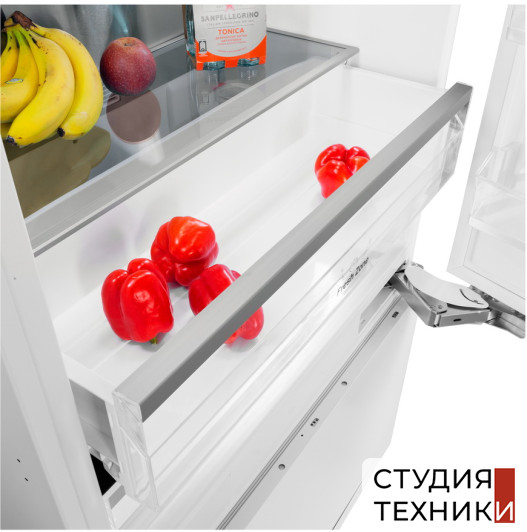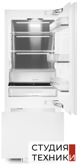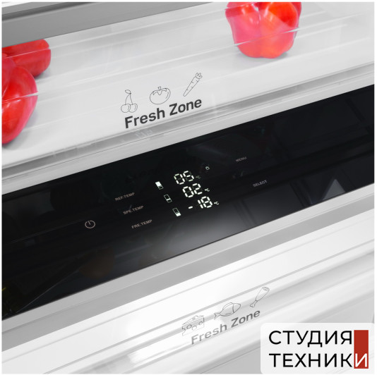 Холодильная камера:- Количество полок в холодильной камере: 3- 3 дверные широкие полки с большими ящиками- Отделение Fresh Zone на 56 л с регулировкой температуры для хранения рыбы и мяса- 1 бокс для фруктов и овощей- Подставка для яиц: 2