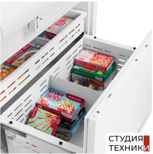 Морозильная камера:- 1 плавно выдвигающийся ящик морозильной камеры. Верхняя полка ящика предназначена для быстрой заморозки продуктов и сохранения их формы - Мощность замораживания: 5.8 кг/24 ч- Емкость для льда