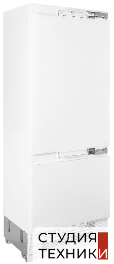 Общие характеристики:- Тип: встраиваемый- Вид: холодильник с морозильником- Количество камер: 2- Количество компрессоров: 1- Разморозка холодильной камеры: No Frost- Разморозка морозильной камеры: No Frost- Общий объем холодильника: 449 л- Полезный объем холодильной камеры: 323 л- Полезный объем морозильной камеры: 126 л- Цвет: белый- Уровень шума: 41 дБ- Класс энергетической эффективности: A+- Размеры (ВхШхГ): 212.5х76х60 см- Размеры ниши для встраивания (ВхШхГ): 212.7-216.7х76.2х60 см
