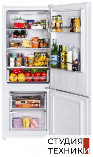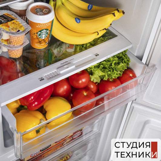 Холодильная камера:- 3 полки из закаленного стекла- 2 боковые полки на дверце- 1 большая выдвижная корзина для фруктов и овощей- 2 лотка для яиц- Специальный держатель для бутылок- Внутреннее освещение: светодиодная подсветка