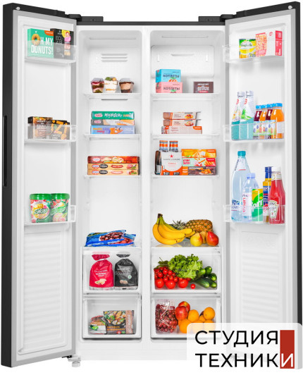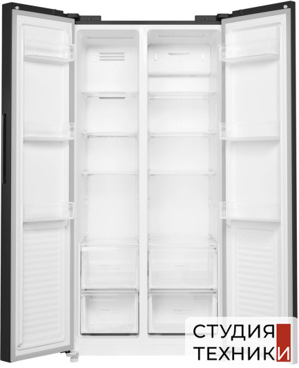 Общие характеристики:- Тип: отдельностоящий- Вид: холодильник с морозильником- Расположение морозильной камеры: сбоку- Количество камер: 2- Количество компрессоров: 1- Разморозка холодильной камеры: NoFrost- Разморозка морозильной камеры: NoFrost- Общий полезный объем холодильника: 430 л- Полезный объем холодильной камеры: 260 л- Полезный объем морозильной камеры: 170 л- Цвет: черный- Уровень шума: 41 дБ- Класс энергетической эффективности: A+- Размеры (ВхШхГ): 177х83.3х63.7 см