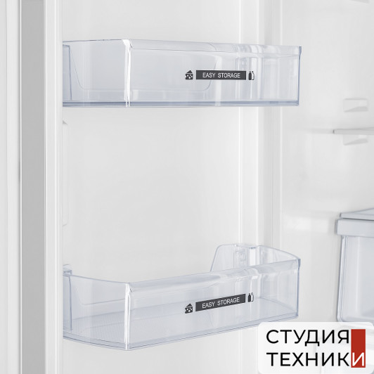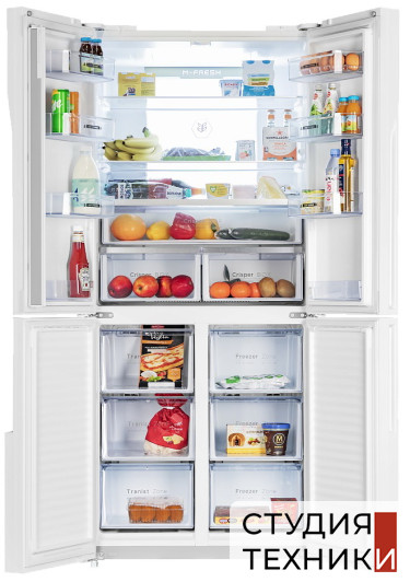 Холодильная камера:- 3 полки из закаленного стекла с металлической окантовкой- 8 боковых полок- 3 выдвижных корзины для фруктов и овощей- 2 лотка для яиц- Внутреннее освещение: Led подсветка