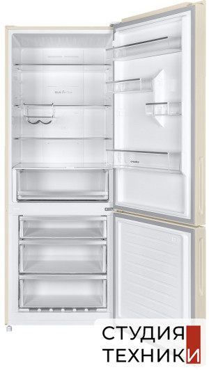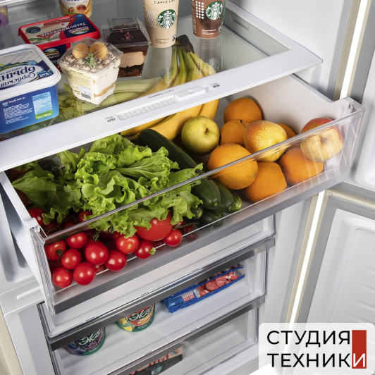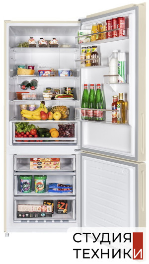 Общие характеристики:- Тип: отдельностоящий- Вид: холодильник с морозильником- Количество камер: 2- Количество компрессоров: 1- Разморозка холодильной камеры: No Frost- Разморозка морозильной камеры: No Frost- Общий объем холодильника: 453 л- Полезный объем холодильной камеры: 336 л- Полезный объем морозильной камеры: 117 л- Цвет: бежевый- Уровень шума: 42 дБ- Класс энергетической эффективности: A++- Размеры (ВхШхГ): 185.5х70.3х70.3 см