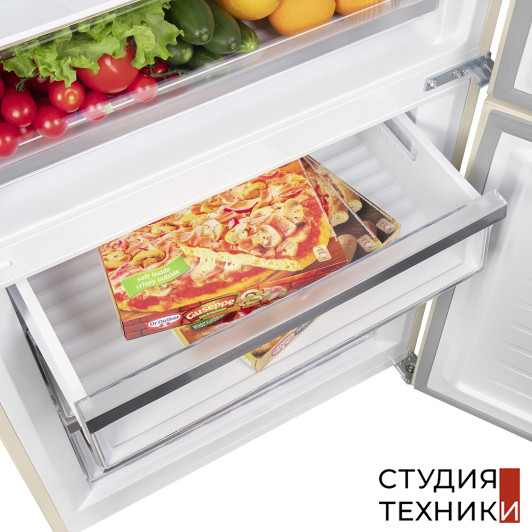 Холодильная камера:- 4 стеклянные полки с металлической окантовкой - Количество полок на дверце: 4- Держатель для бутылок- Ящики для овощей и фруктов: 1- Подставка для яиц- Внутреннее освещение холодильной камеры: светодиодное