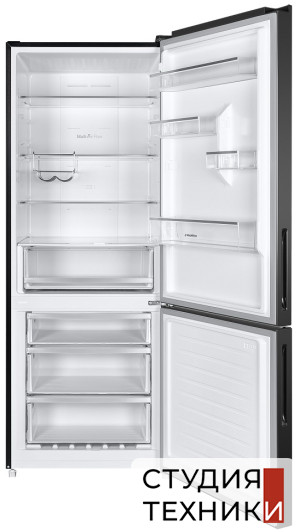 Общие характеристики:- Тип: отдельностоящий- Вид: холодильник с морозильником- Количество камер: 2- Количество компрессоров: 1- Разморозка холодильной камеры: No Frost- Разморозка морозильной камеры: No Frost- Общий объем холодильника: 453 л- Полезный объем холодильной камеры: 336 л- Полезный объем морозильной камеры: 117 л- Цвет: черная нержавеющая сталь- Уровень шума: 42 дБ- Класс энергетической эффективности: A++- Размеры (ВхШхГ): 185.5х70.3х70.3 см