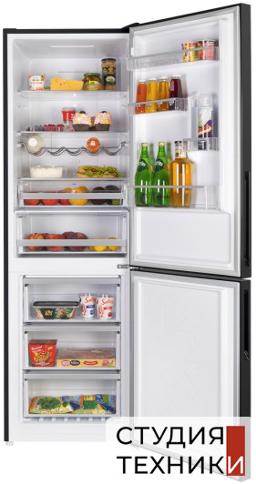 Общие характеристики:- Тип: отдельностоящий- Вид: холодильник с морозильником- Количество камер: 2- Количество компрессоров: 1- Разморозка холодильной камеры: No Frost- Разморозка морозильной камеры: No Frost- Общий объем холодильника: 340 л- Полезный объем холодильной камеры: 240 л- Полезный объем морозильной камеры: 100 л- Цвет: черный- Уровень шума: 42 дБ- Класс энергетической эффективности: A+- Размеры (ВхШхГ): 185.5х59.5х64.2 см