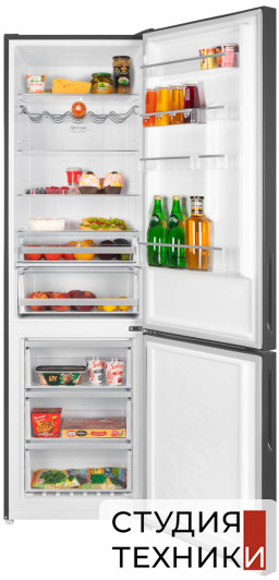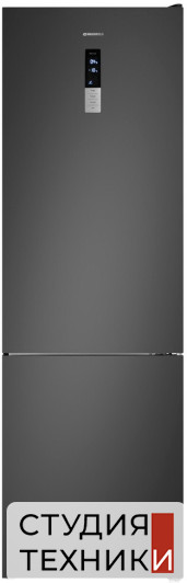 Общие характеристики:- Тип: отдельностоящий- Вид: холодильник с морозильником- Расположение морозильной камеры: снизу- Количество камер: 2- Количество компрессоров: 1- Разморозка холодильной камеры: NoFrost- Разморозка морозильной камеры: NoFrost- Общий полезный объем холодильника: 351 л- Полезный объем холодильной камеры: 253 л- Полезный объем морозильной камеры: 98 л- Цвет: черная нержавеющая сталь- Уровень шума: 42 дБ- Класс энергетической эффективности: A+- Размеры (ВхШхГ): 200х59.5х60 см