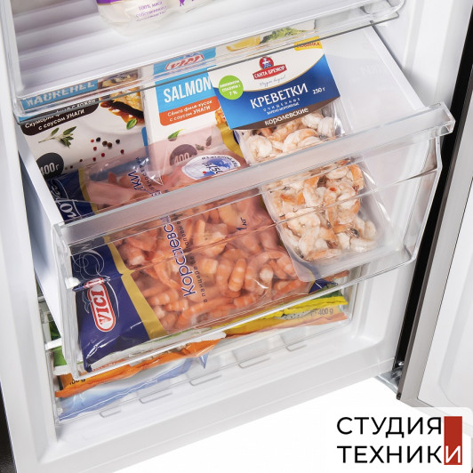 Морозильная камера:- Количество выдвижных ящиков в морозильной камере: 4- Количество полок с крышками: 2- Количество полок на двери: 2- Мощность замораживания: 9,5 кг/сутки- Емкость для льда
