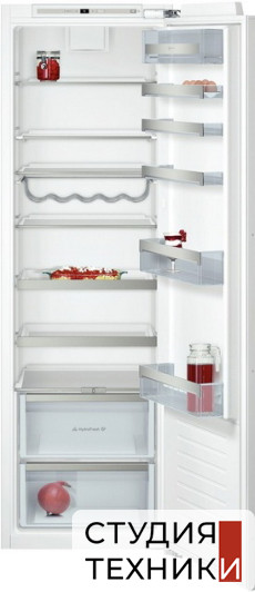 Общие характеристики:- Тип: встраиваемый- Вид: холодильник без морозильника- Количество камер: 1- Количество компрессоров: 1- Разморозка холодильной камеры: капельная (автоматическая)- Общий объем холодильника: 319 л- Цвет: белый- Уровень шума: 37 дБ- Класс энергетической эффективности: A+- Годовое потребление энергии: 116 кВтч/год- Мощность подключения: 0,9 кВт- Размеры (ВхШхГ): 177.2х55.8х54.5 см- Размеры встраивания (ВxШ xГ): 177.5x56x55 см Управление, функции:- Кнопочное управление с цифровым дисплеем- Электронная регулировка температуры- Функция суперохлаждения (температур в холодильной камере понижается до +2 С)- Технология VitaControl – поддержание постоянного уровня температуры Холодильная камера:- 7 полок из ударопрочного стекла, из них 6 – переставляемые по высоте- Зона свежести HydroFresh и бокс для овощей и фруктов на телескопических полозьях- Подвес для бутылок Дополнительная информация:- Led освещение- Угольный фильтр Страна изготовитель:- Германия