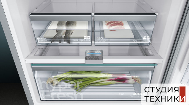 Зона свежести:- HydroFreshBox на телескопических полозьях: сохраняет продукты свежими в три раза дольше- Герметичная зона свежести HydroFreshBox с регулируемой влажностью сохраняет витамины и полезные свойства фруктов и овощей свежими до двух раз дольше