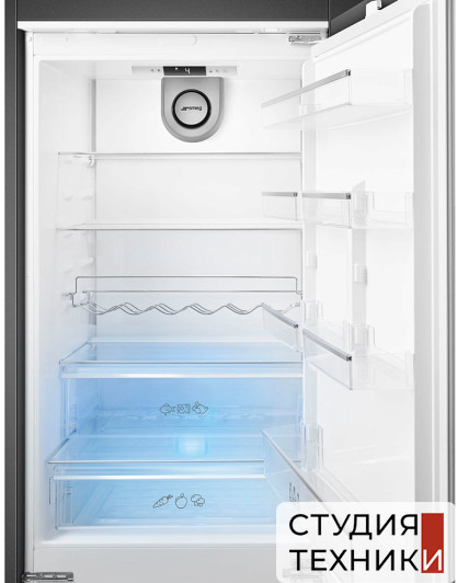 Холодильная камера:- Внутреннее освещение холодильной камеры: LED-подсветка- Общее количество полок в холодильной камере: 4- Количество регулируемых полок: 3- Материал полок: ударопрочное стекло- Отделение для бутылок- Большой ящик/2 ящика для овощей и фруктов- Количество полок на дверце: 6- Подставка для яиц- Зона свежести: 1
