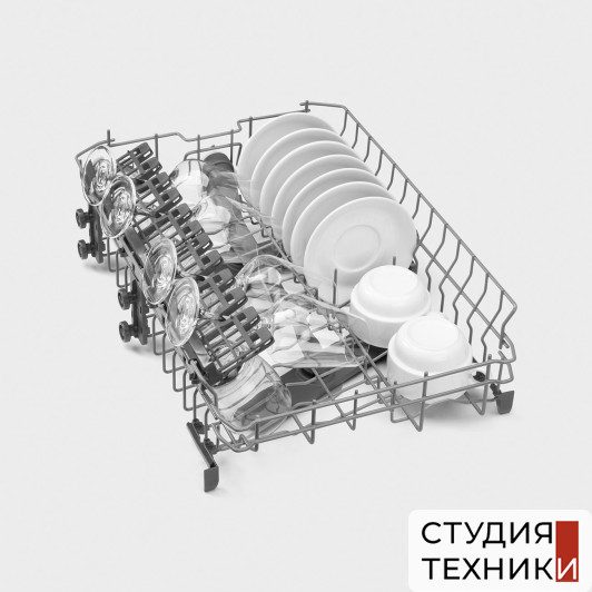 Особенности:- Регулируемая по высоте корзина для посуды- Нижняя корзина с системой Rompi Goccia- Корзина для столовых приборов- 2 корзины- Верхняя корзина: с фиксированными держателями, регулировка по высоте на 2 уровнях с помощью выдвижения- Нижняя корзина: с фиксированными держателями- Слайдерное крепление фасада- Регулируемые ножки