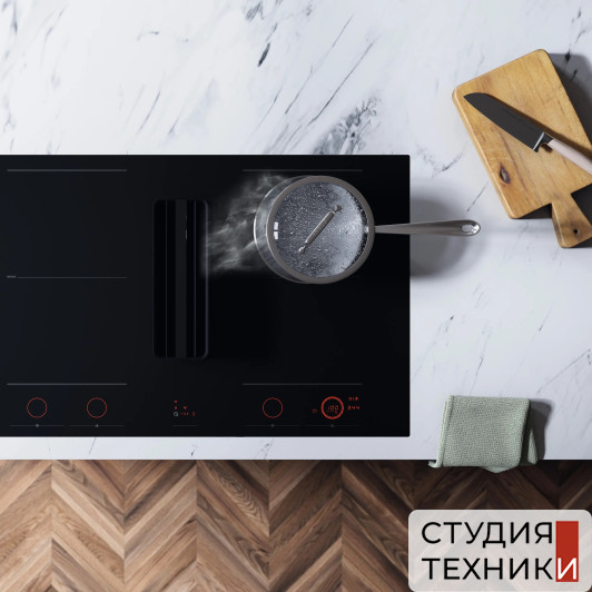 Общие характеристики:- Вид: индукционная варочная панель с вытяжкой- Способ подключения: электрическая- Установка: независимая- Материал: стеклокерамика- Цвет: черный- Количество зон нагрева: 4 шт - Рамка: без рамки- Мощность подключения: 7,4 кВт- Размеры (ВхШхГ): 31х83х52 см - Размеры для встраивания (ШхГ): 78-83.4х49-52.4 см