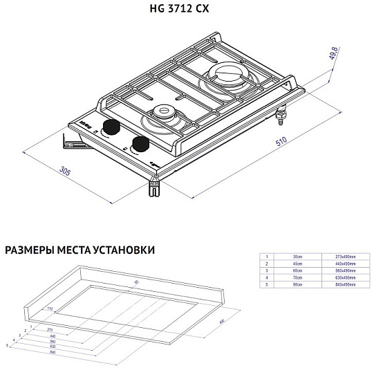 Общие характеристики:- Тип: газовая- Установка: независимая- Материал: нержавеющая сталь- Количество зон нагрева: 2 шт- Цвет: нержавеющая сталь- Цвет фурнитуры: черный- Размеры (ВхШхГ): 50х30.5х51 см- Размеры ниши для встраивания (ВхШхГ): 30х27.3х49 см- Вес: 7 кг