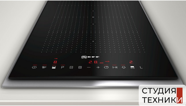 Индукционная варочная поверхность Neff N53TD40N0 Общие характеристики:- Тип: индукционная- Материал: стеклокерамика- Установка: независимая- Цвет: черный- Количество зон нагрева: 2шт. - Рамка: металлическая по периметру- Мощность подключения: 3,7 кВт- Размеры (ВхШхГ): 4.5х30.6х54.6 см - Размеры для встраивания (ШхГ): 5.1х27х49-50 см Управление:- Сенсорные переключатели TouchControl - 17 ступеней мощности - Таймер: с отключением, без отключения со звуковым сигналом- Цифровая индикация выбранной ступени нагрева Функции:- Функция PotBoost для индукционных зон нагрева - Функция PowerMove (делит FlexZone на три участка с разным температурным режимом) используя данную функцию, можно разделить FlexZone на три участка, каждый - со своим уровнем мощности: впереди плиты - зона с сильным нагревом для кипения, в середине - средние - средний нагрев для готовки и сзади - слабый нагрев для поддержания температуры готовых блюд.- Функция PowerManagement: позволяет ограничить максимальную мощность электрической варочной панели, что может быть необходимо в домах со слабой проводкой- Функция Cleaning-пауза (блокировка клавиш управления на 20 секунд для уборки) Технические характеристики зон нагрева:- Зона FlexZone - Количество HighSpeed зон: 2- 1 конфорка: 400х210 мм, 3.3 кВт (в режиме PotBoost - 3.7 кВт) - 2 конфорка: 210 мм, 2.2 кВт (в режиме PotBoost - 3.7 кВт) Дополнительная информация:- Стеклокерамика без декора - Главный выключатель - Длина кабеля: 100 см - Возможность комбинирования с варочными панелями шириной: 60, 80, 90 см Безопасность:- Двухпозиционные индикаторы остаточного тепла - Автоматическое защитное отключение- Блокировка от детей Страна изготовитель:- Германия