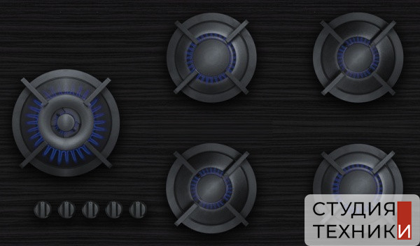Технические характеристики зон нагрева:- Тип конфорок: 5 газовые- 2 горелки малой мощности 0,3-2 кВт- 2 горелки средней мощности: 0,2-3 кВт- 1 комбинированная горелка WOK/Simmer: 0,2-5 кВт