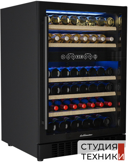 Винный шкаф MEYVEL MV46-KBT2Общие характеристики:- Тип: отдельностоящий- Вместимость, бут. 0,75л: 46 шт- Общий объем: 150 л- Количество температурных зон: 2- Количество камер: 1- Диапазон регулировки температуры в верхней зоне: от +5 до +10С- Диапазон регулировки температуры в нижней зоне: от +10 до +18С- Диапазон влажности: 60-80%- Цвет: черный- Уровень шума: 45 дБ- Класс энергетической эффективности: А- Размеры (ВхШхГ): 84х59.5х57 см Управление, функции:- Сенсорное управление- Цифровой дисплей температуры- LED освещение