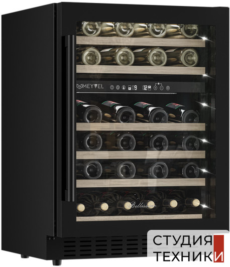 Винный шкаф MEYVEL MV46PRO-KBT2Общие характеристики:- Тип: отдельностоящий- Вместимость, бут. 0,75л: 46 шт- Общий объем: 145 л- Количество температурных зон: 2- Количество камер: 1- Диапазон регулировки температуры в верхней зоне: от +5 до +12С- Диапазон регулировки температуры в нижней зоне: от +12 до +20С- Диапазон влажности: 60-80%- Цвет: черный- Уровень шума: 40 дБ- Класс энергетической эффективности: А- Размеры (ВхШхГ): 84х59.5х57 см Управление, функции:- Сенсорное управление- Цифровой дисплей температуры- LED освещение
