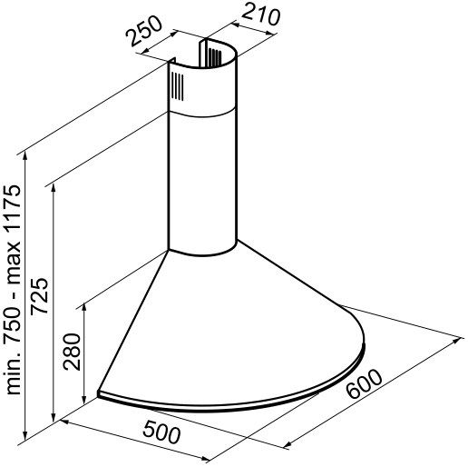 Общие характеристики:- Тип: купольная- Монтаж: каминная, настенная- Режим работы: отвод/рециркуляция- Уровень шума: 62 дБ- Цвет: матовый черный- Цвет окантовки: медь- Материал корпуса: нержавеющая сталь- Максимальная производительность: 950 м.куб/ч- Количество двигателей: 1- Потребляемая мощность: 0,250 кВт- Диаметр воздуховода: 120/150 мм- Размеры (ВхШхГ): 75-117.5х60х50 см- Вес: 6 кг