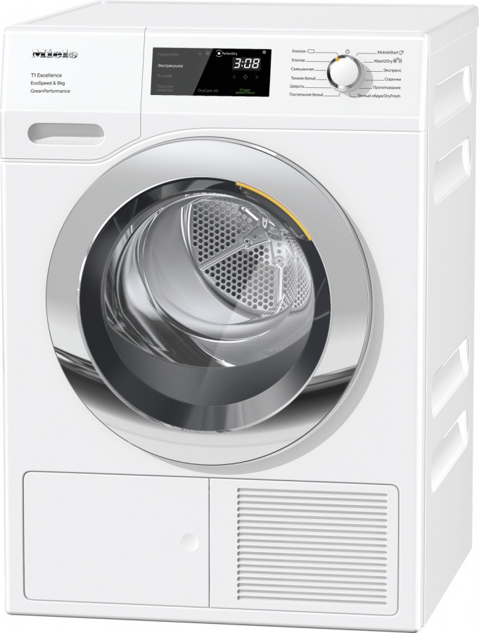Сушильная машина Miele TEF775WP Общие характеристики:- Тип установки: отдельностоящая- Тип сушки: конденсационная- Тип загрузки: фронтальная- Управление: электронное- Класс энергопотребления: А+++- Максимальная загрузка: 8 кг- Количество программ: 10- Уровень шума 66 дБ- Цвет: белый- Размеры (ВxШxГ): 85х59.6х63.6смУправление:- Электронное управление- Поворотный переключатель- Дисплей DirectSensor белый - Индикация остаточного времени- Индикация выполнения программы- Индикация очистки фильтра- Индикация «Вылить конденсат»- Отсрочка старта до 24 часовПрограммы сушки:- Хлопок- Хлопок Есо- Деликатная- Тонкое бельё- Сорочки (рубашки)- Шерсть- Экспресс- Пропитывание- Постельное белье- Тёплый обдув/DryFresh- EcoSpeedДополнительная информация:- Сушильная машина с тепловой помпой- Технология EcoDry: система фильтров и теплообменник поддерживают низкое энергопотребление и малую продолжительность работы программ- Ароматизаторы FragranceDos- Функция DryFresh: длительный обдув теплым воздухом позволяет избавиться от неприятных запахов- Функция Perfect Dry: регулирует длительность сушки, определяя проводимость воды и остаточную влажность белья- Реверсивное вращение- Система Perfect Dry: определяет остаточную влажность белья и обеспечивает наилучший результат сушки при любом качестве воды- Функция AddLoad: возможность дозагрузки белья после запуска программы- Объединение техники в единую сеть с помощью Miele@home- Сетевая функция Wash2Dry: благодаря новой функции Wash2Dry ваша стиральная машина сама отправляет данные в сушильную машину после стирки. Последняя автоматически выбирает соответствующую программу для вашего белья. Всё, что от вас требуется, – загрузить бельё из стиральной машины в сушильную, включить её и выбрать функцию Wash2Dry- Опция DryCare 40: После программы стирки при 40 C можно сразу, без предварительной сортировки, загрузить одежду в барабан сушильной машины. Это существенно экономит ваше время. Данная опция позволяет сушить бельё, которое рекомендовано стирать при 40 С, но не разрешено сушить в сушильной машине. (Не подходит для изделий из шерсти и шёлка)- Функция HygieneDry: позволяет устранить до 99,99 % бактерий и до 99,9 % вирусов во время сушки. Это достигается благодаря длительному времени выдержки температуры- Технология EcoSpeed: позволяет высушить бельё очень быстро, с заботой об окружающей среде и с максимальным классом энергоэффективности A+++. При полной загрузке EcoSpeed может сократить время сушки более чем на 20 минут- Сотовый барабан Honey Comb- Мотор ProfiEco- Отсрочка запуска- Мягкие ребра внутри барабана- Возможность установки в колонну со стиральной машиной- Возможность установки под столешницу (высота ниши 85 см)- Светодиодное освещение барабана- Емкость для конденсата- Дверной упор слева Безопасность:- Блокировка ПИН-кодом- Встроенная система отвода конденсата- Емкость для сбора конденсата- Предохранитель 10 АСтрана производителя:- Чехия