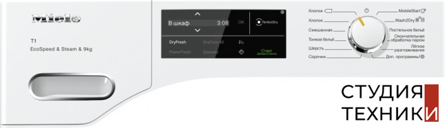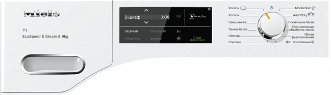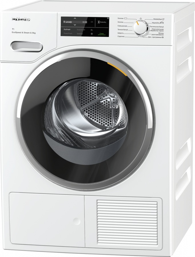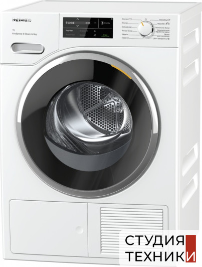 Сушильная машина Miele TWL780WP Общие характеристики:- Тип установки: отдельностоящая- Тип сушки: конденсационная- Тип загрузки: фронтальная- Управление: электронное- Класс энергопотребления: А+++- Максимальная загрузка: 9 кг- Количество программ: 20- Уровень шума 64 дБ- Цвет: белый- Размеры (ВxШxГ): 85х59.6х64.3смУправление:- Электронное управление- Поворотный переключатель- Дисплей DirectSensor белый- Панель с наклоном 5 градусов- Индикация остаточного времени- Индикация выполнения программы- Индикация очистки фильтра- Индикация «Вылить конденсат»- Отсрочка старта до 24 часовПрограммы сушки:- Автоматическая +- Хлопок- Хлопок Есо- Деликатная- Тонкое бельё- Сорочки (рубашки)- Шелк- Шерсть- Экспресс- Джинсы- Верхняя одежда- Пропитывание- Спортивное белье- Подушки- Холодный обдув- Тёплый обдув DryFresh- Сушка в корзине- Лёгкое разглаживание- Постельное белье- Окончательная обработка паромДополнительная информация:- Сушильная машина с тепловой помпой- Технология EcoDry: система фильтров и теплообменник поддерживают низкое энергопотребление и малую продолжительность работы программ- Ароматизаторы FragranceDos- Функция DryFresh: длительный обдув теплым воздухом позволяет избавиться от неприятных запахов- Функция Perfect Dry: регулирует длительность сушки, определяя проводимость воды и остаточную влажность белья- Реверсивное вращение- Система Perfect Dry: определяет остаточную влажность белья и обеспечивает наилучший результат сушки при любом качестве воды- Функция AddLoad: возможность дозагрузки белья после запуска программы- Объединение техники в единую сеть с помощью Miele@home- Сетевая функция Wash2Dry: благодаря новой функции Wash2Dry ваша стиральная машина сама отправляет данные в сушильную машину после стирки. Последняя автоматически выбирает соответствующую программу для вашего белья. Всё, что от вас требуется, – загрузить бельё из стиральной машины в сушильную, включить её и выбрать функцию Wash2Dry- Функция HygieneDry: позволяет устранить до 99,99 % бактерий и до 99,9 % вирусов во время сушки. Это достигается благодаря длительному времени выдержки температуры- Опция DryCare 40: После программы стирки при 40 C можно сразу, без предварительной сортировки, загрузить одежду в барабан сушильной машины. Это существенно экономит ваше время. Данная опция позволяет сушить бельё, которое рекомендовано стирать при 40 С, но не разрешено сушить в сушильной машине. (Не подходит для изделий из шерсти и шёлка)- Технология EcoSpeed: позволяет высушить бельё очень быстро, с заботой об окружающей среде и с максимальным классом энергоэффективности A+++. При полной загрузке EcoSpeed может сократить время сушки более чем на 20 минут- Система SteamFinish – замена глажке: В начале сушки программа SteamFinish деликатно распыляет воду внутри сотового барабана, где она нагревается под воздействием сухого воздуха. Образующийся пар заметно разглаживает бельё- Сотовый барабан Honey Comb- Мотор ProfiEco- Отсрочка запуска- Мягкие ребра внутри барабана- Возможность установки в колонну со стиральной машиной- Возможность установки под столешницу (высота ниши 85 см)- Светодиодное освещение барабана- Емкость для конденсата- Дверной упор слева- Перенавешиваемая дверца Безопасность:- Блокировка ПИН-кодом- Встроенная система отвода конденсата- Емкость для сбора конденсата- Предохранитель 10 АСтрана производителя:- Чехия