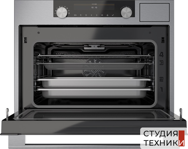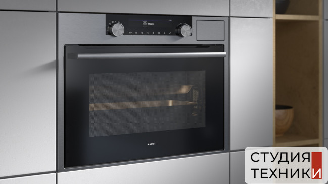 Общие характеристики:- Тип: электрический- Вид духовки: комбинированный духовой шкаф с функциями пара и СВЧ- Цвет: нержавеющая сталь- Цвет фурнитуры: нержавеющая сталь- Объем: 50л- Количество режимов нагрева: 18- Количество авто программ: 143- Максимальная температура в духовке: 230 °С- Очистка: паровая AquaClean- Резервуар для воды: 1,3 л- Мощность подключения: 3 кВт- Размеры (ВхШхГ): 45,5x59,5x54,6 см- Размеры ниши (ВхШхГ): 45x56x55 см