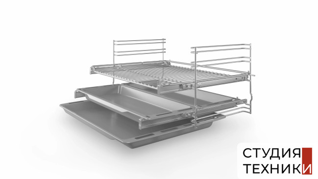 Принадлежности:- 1 эмалированный противень- 2 узких противня- 1 решетка- Телескопические направляющие на 2-х уровнях