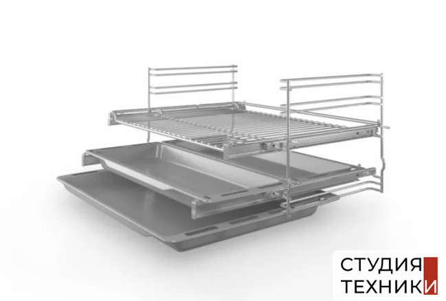 Принадлежности:- 1 универсальный противень- 1 комбинированная решетка- 2 узких противня- Телескопические направляющие на 2-х уровнях