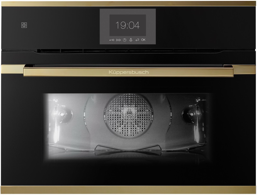 Компактный духовой шкаф Kuppersbusch CBP 6550.0 S4Общие характеристики:- Тип: электрический- Установка: независимая- Цвет: черное стекло- Цвет фурнитуры: Gold- Объем духовки: 44 л - Мощность подключения: 2.9 кВт- Очистка: пиролитическая (3 уровня)- Размеры (ВхШхГ): 45.5х59.5х55.9 см- Размеры ниши для встраивания (ВхШхГ): 45х56х55 см