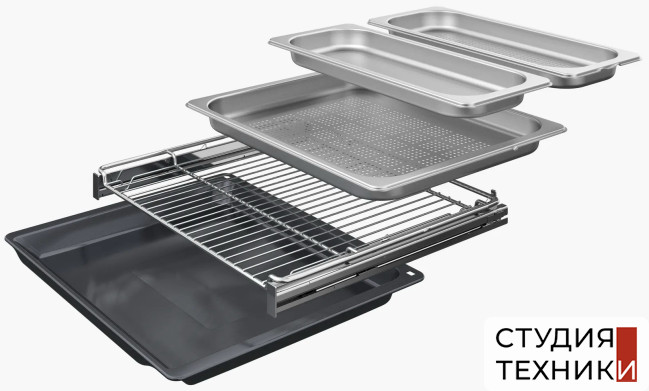Принадлежности:- 1 универсальный противень- 1 комбинированная решетка- 1 большой поддон для приготовления на пару- 2 малых поддона для приготовления на пару- Телескопические направляющие