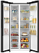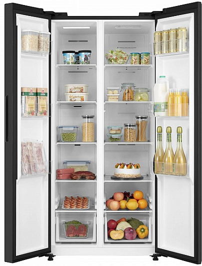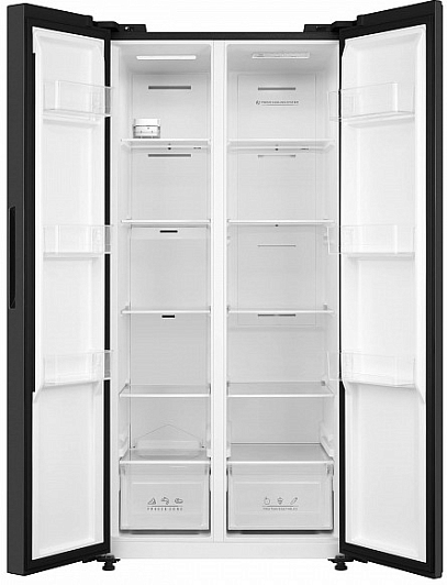 Общие характеристики:- Тип: отдельностоящий- Вид: Side by Side- Количество камер: 2- Количество компрессоров: 1 - Разморозка холодильной камеры: No Frost- Разморозка морозильной камеры: No Frost- Общий объем холодильника: 442 л- Полезный объем холодильной камеры: 266 л- Полезный объем морозильной камеры: 176 л- Цвет: черный- Уровень шума: 41 дБ- Класс энергетической эффективности: A+- Годовое потребление энергии: 408 кВтч/год- Размеры (ВхШхГ): 177.5х83.5х63.5 см
