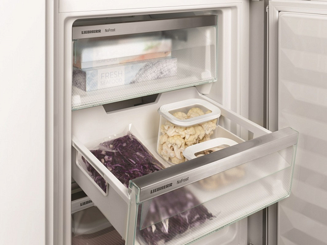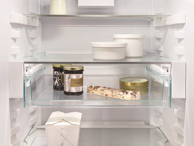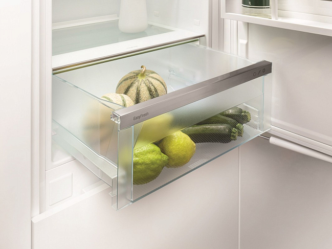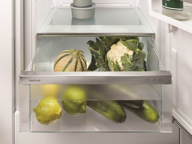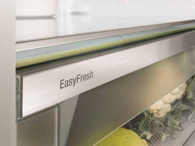 Холодильное отделение:- Освещение: светодиодное потолочное освещение- 6 полок из закаленного стекла, из них 5 регулируемые по высоте- Количество полок на двери для бутылок: 1- Количество полок на двери для хранения консервов: 2- Контейнеры для овощей и фруктов Easy Fresh с регулировкой влажности: 3- Лоток для яиц- Механизмы выдвижения ящиков в холодильном отделении: частично выдвигаемые телескопические направляющие- Угольный фильтр FreshAir