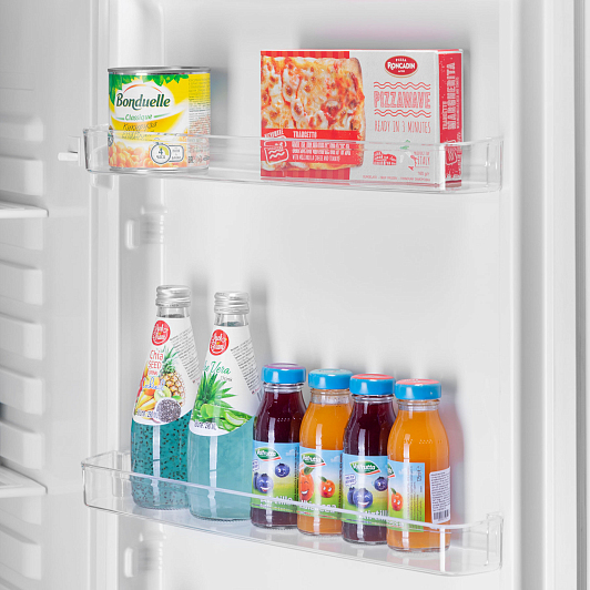 Холодильная камера:- 3 полки из закаленного стекла- 3 боковые полки- 1 ящик для фруктов и овощей- подставка для яиц