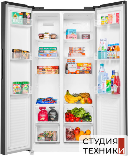 Общие характеристики:- Тип: отдельностоящий- Вид: холодильник с морозильником- Расположение морозильной камеры: сбоку- Количество камер: 2- Количество компрессоров: 1- Разморозка холодильной камеры: NoFrost- Разморозка морозильной камеры: NoFrost- Общий полезный объем холодильника: 430 л- Полезный объем холодильной камеры: 260 л- Полезный объем морозильной камеры: 170 л- Цвет: темная нержавеющая сталь- Уровень шума: 41 дБ- Класс энергетической эффективности: A+- Размеры (ВхШхГ): 177х83.3х63.7 см