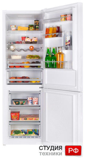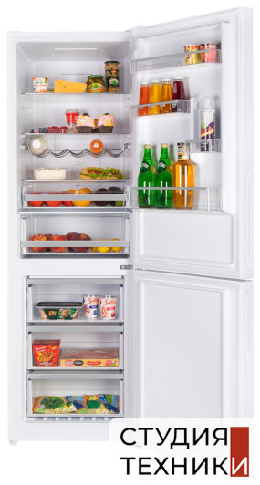 Холодильная камера:- Количество полок в холодильной камере: 3 (стеклянные с металлической окантовкой)- Количество полок на дверце холодильной камеры: 4- Держатель для бутылок- Ящики для овощей и фруктов: 2- Подставка для яиц: 2- Внутреннее освещение холодильной камеры: светодиодное