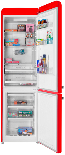 Общие характеристики:- Тип: отдельностоящий- Вид: холодильник с морозильником- Расположение морозильной камеры: снизу- Количество камер: 2- Количество компрессоров: 1- Разморозка холодильной камеры: NoFrost- Разморозка морозильной камеры: NoFrost- Общий полезный объем холодильника: 250 л- Полезный объем холодильной камеры: 178 л- Полезный объем морозильной камеры: 72 л- Цвет: красный- Уровень шума: 45 дБ- Класс энергетической эффективности: A+- Размеры (ВхШхГ): 186.5х54х60 см