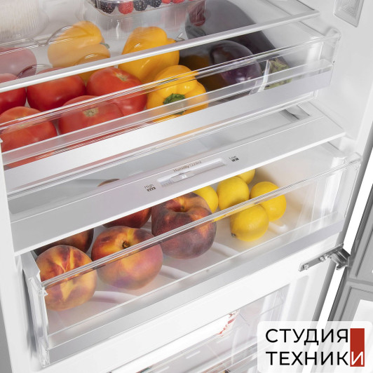 Управление, функции:- Элементы управления: сенсорные кнопки- Дисплей- Функция «Отпуск»- Функция «Быстрая заморозка»- Функция «SMART ECO»- Блокировка от детей- Сигнализация открытой двери- Сигнализация повышения температуры- Регулировка уровня влажности в зоне свежести- Функция задержки включения холодильника (защита от повреждения при сбое питания)