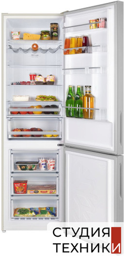 Общие характеристики:- Тип: отдельностоящий- Вид: холодильник с морозильником- Количество камер: 2- Количество компрессоров: 1- Разморозка холодильной камеры: No Frost- Разморозка морозильной камеры: No Frost- Общий объем холодильника: 377 л- Полезный объем холодильной камеры: 271 л- Полезный объем морозильной камеры: 106 л- Цвет: бежевый- Уровень шума: 42 дБ- Класс энергетической эффективности: A+- Размеры (ВхШхГ): 200х59.5х60 см