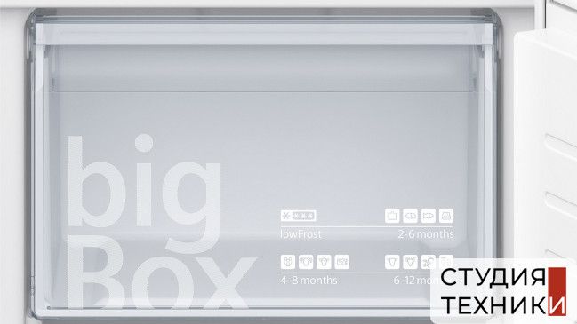 Морозильное отделение:- Время сохранения холода при отключении электроэнергии: 26 ч- Способ оттаивания: ручное- 2 ящика- Отделение bigBox- Лоток для приготовления кубиков льда: 1