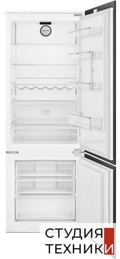 Общие характеристики:- Тип: встраиваемый- Вид: холодильник с морозильником- Количество камер: 2- Количество компрессоров: 1- Разморозка холодильной камеры: No Frost- Разморозка морозильной камеры: No Frost- Общий объем холодильника: 370 л- Объем холодильной камеры: 280 л- Объем морозильной камеры: 90 л- Цвет: белый- Количество дверей: 2- Дверной упор: справа- Уровень шума: 35 дБ- Климатический класс: SN-T- Годовое потребление энергии: 247 кВт/ч- Размеры (ВхШхГ): 194х68.9х55 см- Размеры ниши для встраивания (ВхШхГ): 194.3-194.4х71.4х56.3 см