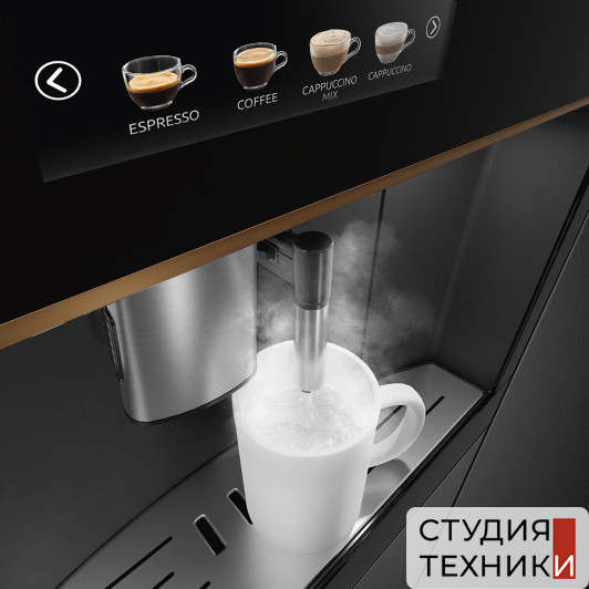 Дополнительная информация:- Конусная мельница- Переставляемая по высоте насадка для чашек: 85-142 мм- Съёмный контейнер для молока- Съёмный контейнер для кофейной гущи и капель- Дозатор пара- Автоматические программы промывки и очистки от накипи- Система плавного закрытия дверцы
