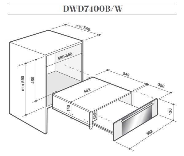 Общие характеристики:- Тип: электрическая- Цвет: черный- Объем: 24 л- Максимальный загрузочный вес: 20 кг- Диапазон температуры: 30-70- Потребляемая мощность 15 кВт- Размеры (ВхШхГ): 7.7х59.5х56.8 см- Размеры ниши для встраивания (ВхШхГ): 10х56-56.8х55 см
