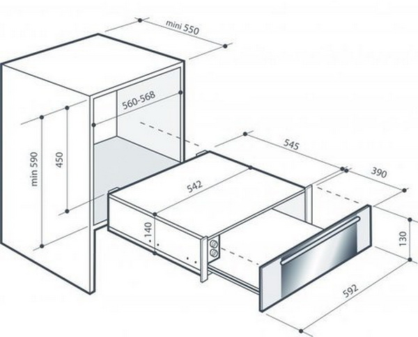 Общие характеристики:- Тип: электрическая- Цвет: серый- Объем: 24 л- Максимальный загрузочный вес: 20 кг- Диапазон температуры: 30-70- Потребляемая мощность 15 кВт- Размеры (ВхШхГ): 7.7х59.5х56.8 см- Размеры ниши для встраивания (ВхШхГ): 10х56-56.8х55 см
